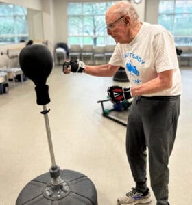 For fellow resident Tom Conforti, the program has been a stabilizing force. Diagnosed with Parkinson’s shortly before moving to Plymouth Place, he’s been in Rock Steady Boxing for more than three years. “I can live with this,” said the 89-year-old. “I’m grateful it’s here. My best friends from high school and college passed away from Parkinson’s. There was nothing like this back then.”